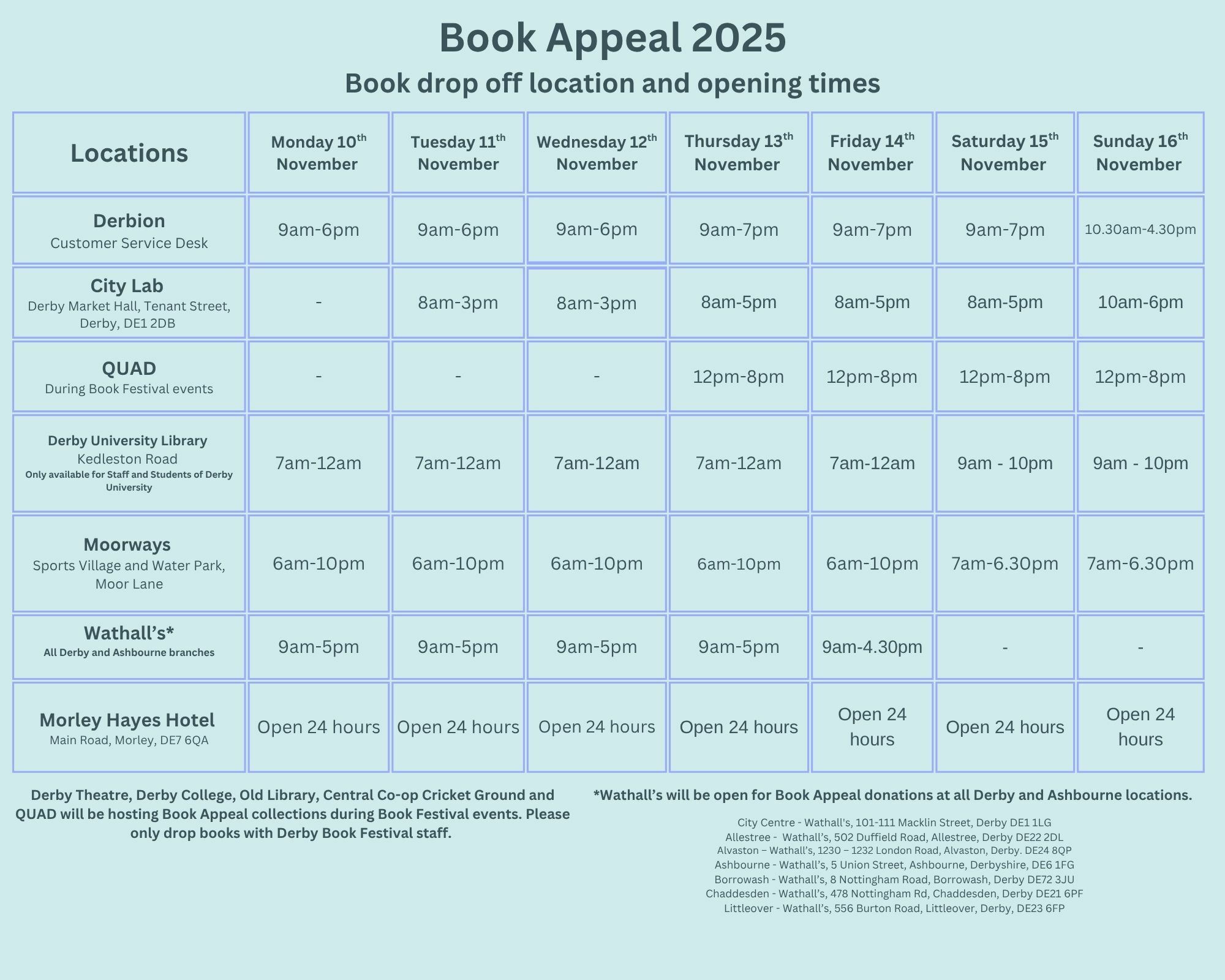 We have some amazing partners around Derby City that host collection points. A massive thanks to Derbion, City Lab, QUAD, The University of Derby, Moorways Sports Village, Wathall's, and Cosy. If you would like to donate books then please check back closer to the Autumn Festival to check when our partners are open.