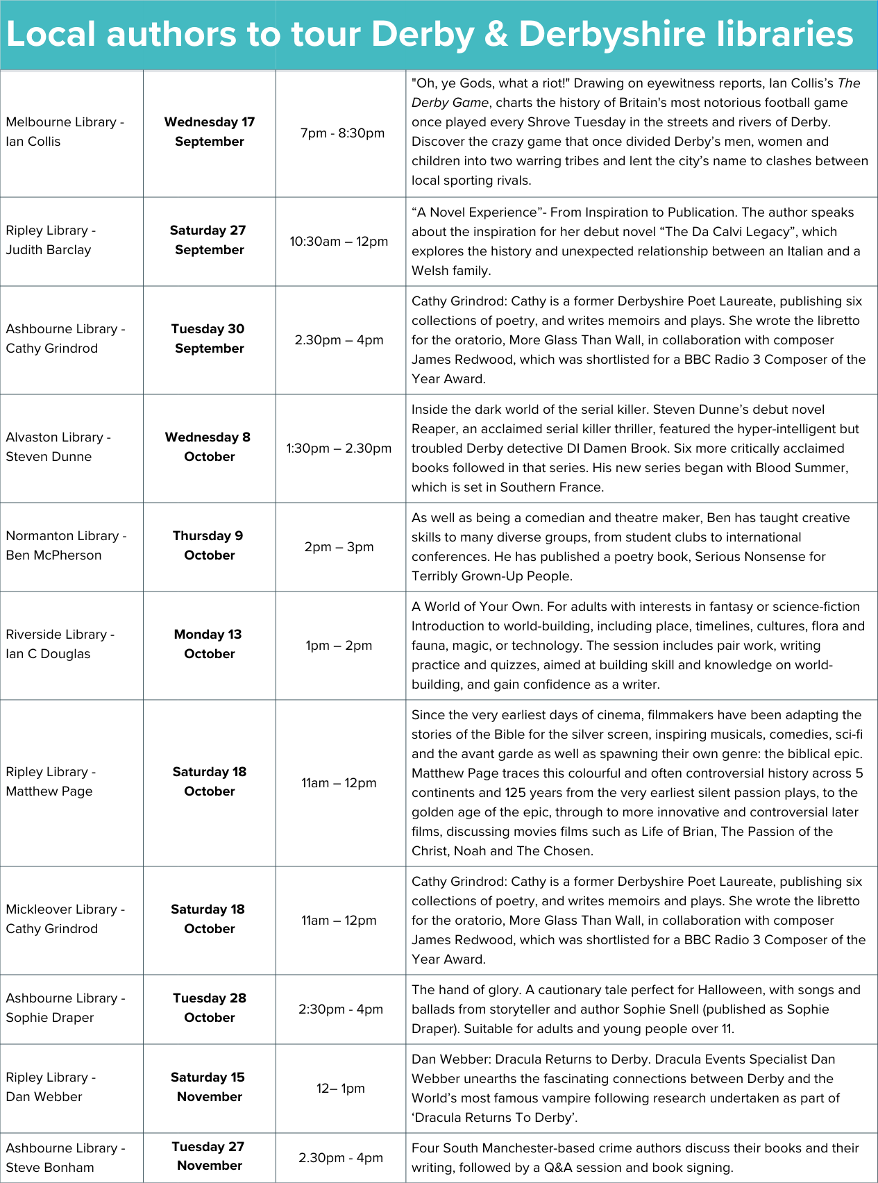 Further details of the talks are available online: https://www.derbybookfestival.co.uk/news/local-authors-to-tour-derby-derbyshire-libraries